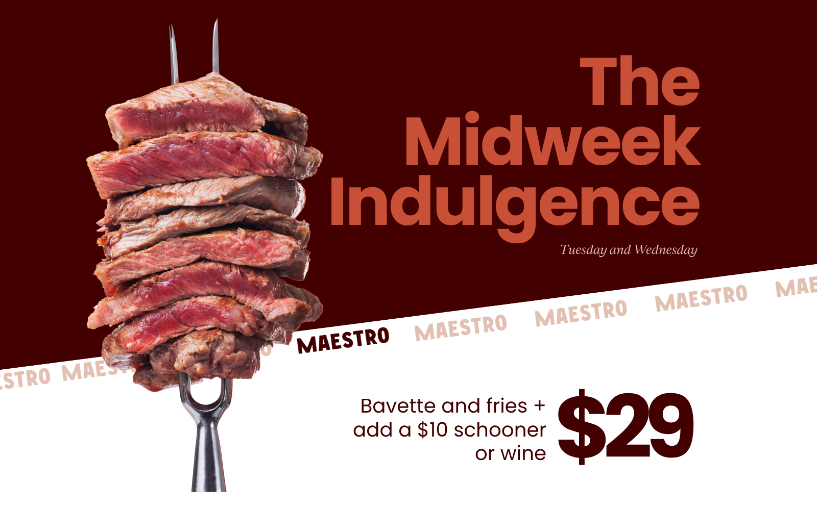Savour the simplicity: Bavette & Frites for $29, plus a $10 wine or schooner.