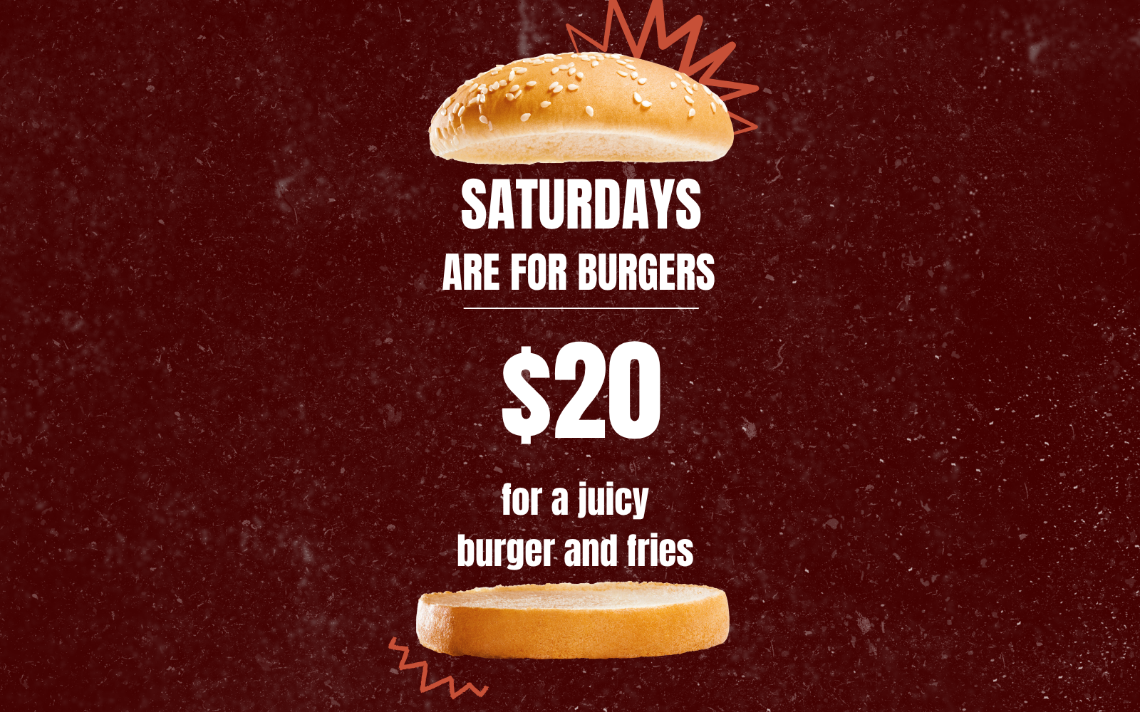 Juicy, cheeky burgers for $20 every Saturday. Messy hands encouraged.